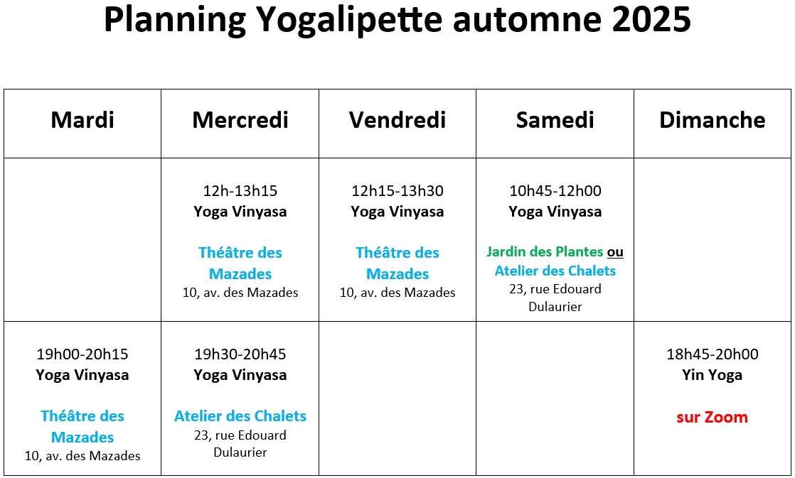 Pour être rapidement prévenu(e) par WhatsApp de tout changement à l’horaire ou annonce importante, veuillez installer l’application pour smartphone et me communiquer votre numéro de téléphone à cette adresse: claudine@yogalipette.com.